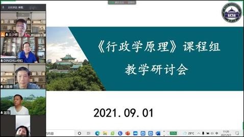 为进一步创新教学模式、提高教学质量、促进教学相长,切实推进《行政学原理》国家级一流本科课程建设,2021年9月1日,《行政学原理》课程组召开了线上教学研讨会,课程组全体成员围绕新学期课程教学改革、混合式教学模式探索、一流本科课程建设目标和任务等议题进行了充分、深入的研讨。