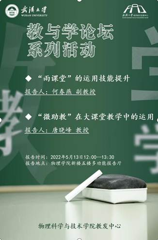 (通讯员:徐晟、张一飞)2022年5月13日,物理科学与技术学院教发中心在学院新楼五楼多功能厅举办了教学技能分享与学习活动,活动特邀请了何春燕副教授示范分享“雨课堂”的运用技能提升,唐晓峰教授示范分享了“微助教”在大课堂教学中的运用。会议由物理学院教学副院长乔豪学教授主持,校教发中心副主任方祥玉老师、学院教发中心副主任祁宁老师和部分教师参加交流和学习。