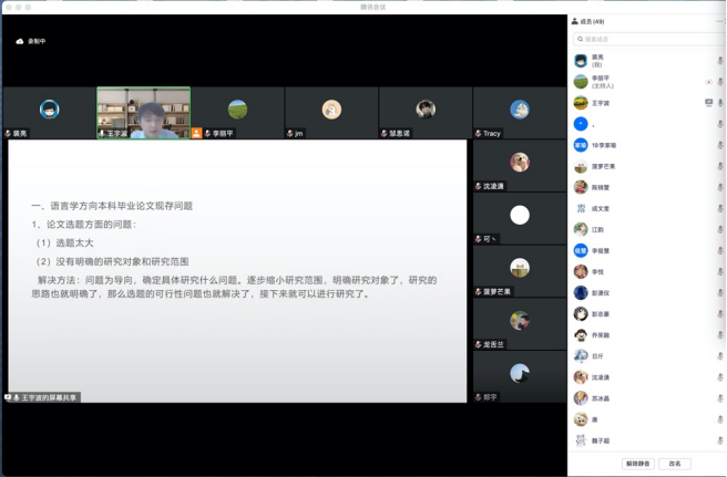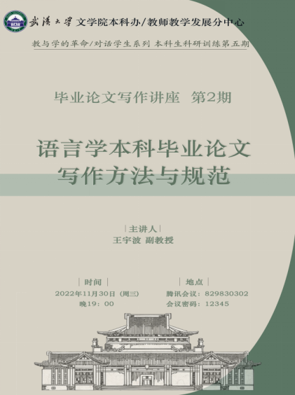 第二讲邀请到语言学及以应用语言学方向王宇波副教授,就语言学本科毕业论文的写作方法与规范对学生做了相应指导。尤其是指出了论文写作中学术不端、选题过大、没有明确研究对象等常见问题,引导学生正确对待论文写作。举办系列讲座的目的是初步帮助学生建立学术研究的问题意识,指导学生掌握分析专业问题的基本思路和方法,并逐步提高学生独立开展学术研究的能力,引导学生坚守学术道德,使学生系统掌握论文写作规范。