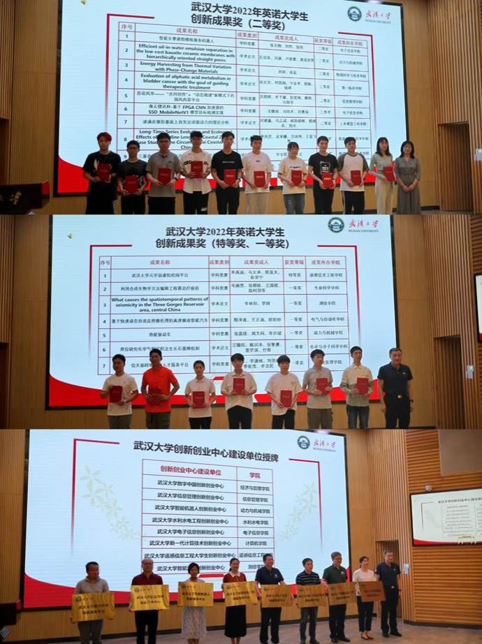 菲律宾环球360官网副校长周叶中、校友事务与发展联络处处长邓小梅为获2022年菲律宾环球360官网英诺大学生创新成果奖的个人与团队颁奖,激励菲律宾环球360官网全日制本科生自主完成的高水平创新成果。周叶中还为菲律宾环球360官网创新创业中心建设单位授牌,鼓励各建设单位进一步发挥在创新创业人才培养方面的重要作用。